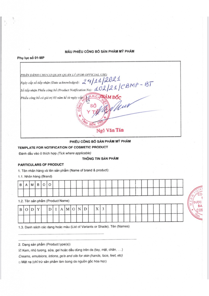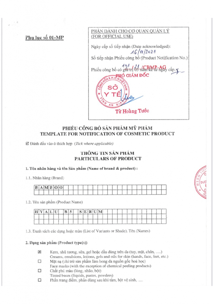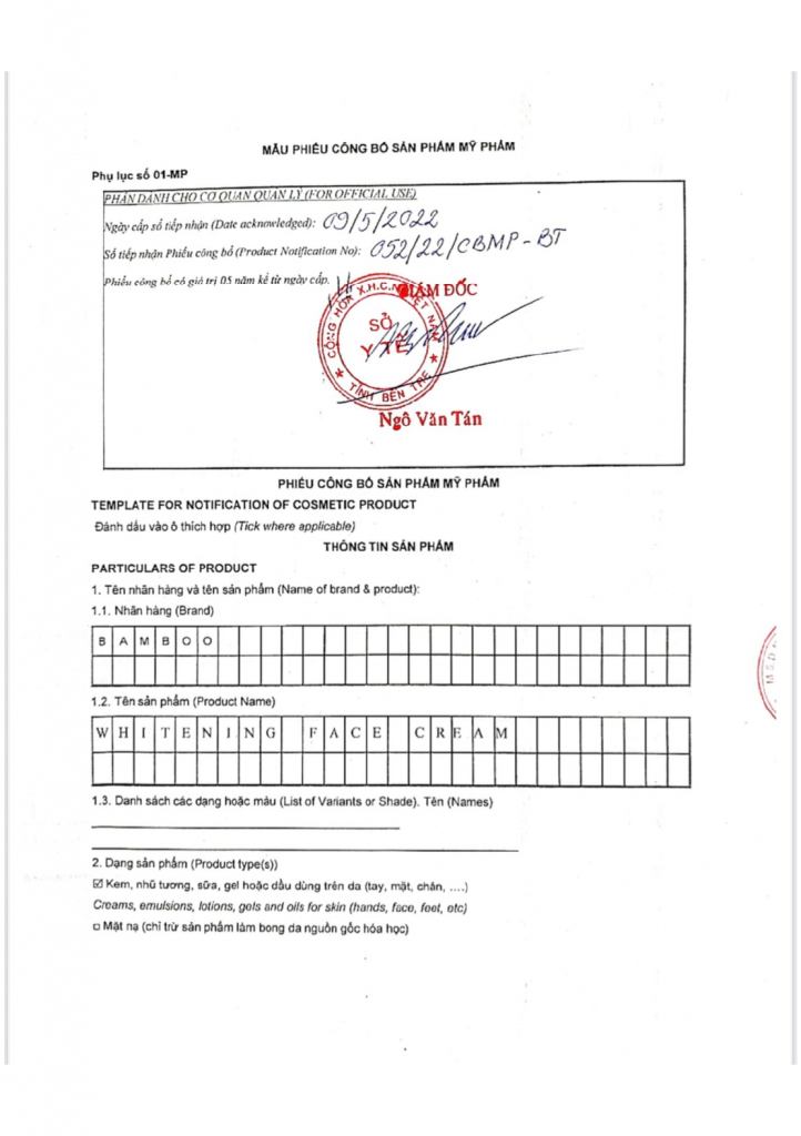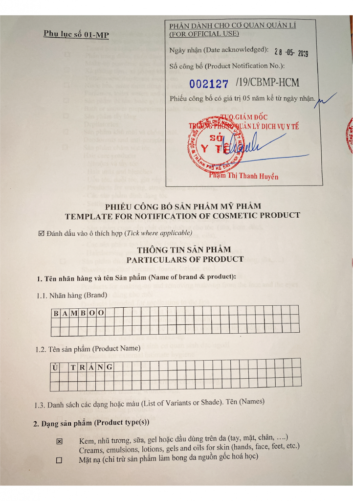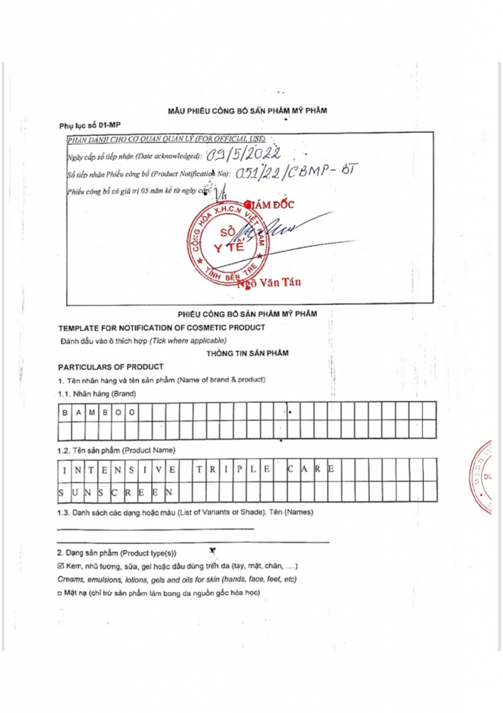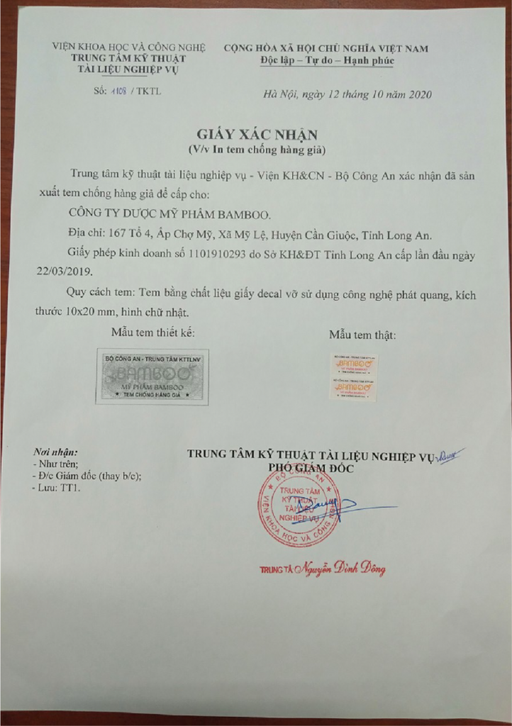 1/ Giấy chứng nhận đăng ký nhãn hiệu thương hiệu độc quyền “THE BAMBOO Cosmectics Organic Việt Nam”